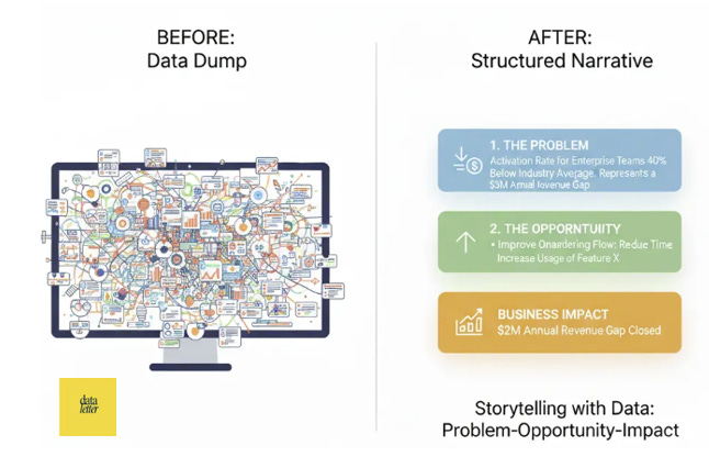 After a decade as a data scientist in consulting and product analytics, I’ve seen brilliant product ideas stall because the data was presented as evidence rather than a narrative. Here’s how to change that.