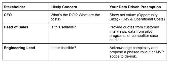 The Head of Sales will ask about sellability. Incorporate data from customer interviews or a pilot program that shows clear demand. Reference a competitor’s success to de-risk the concept.
