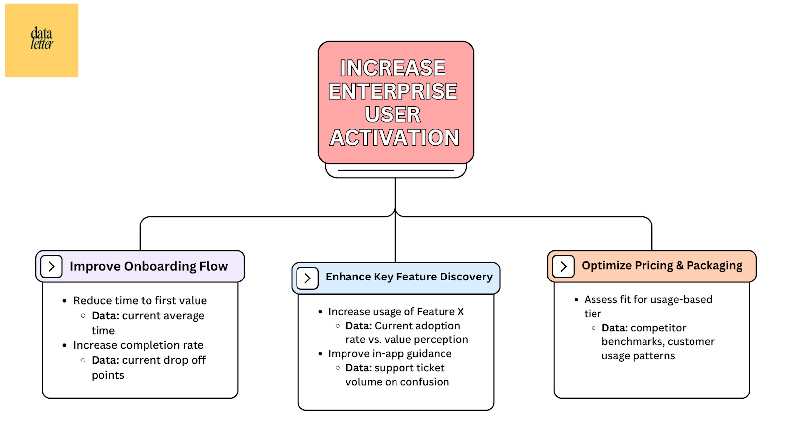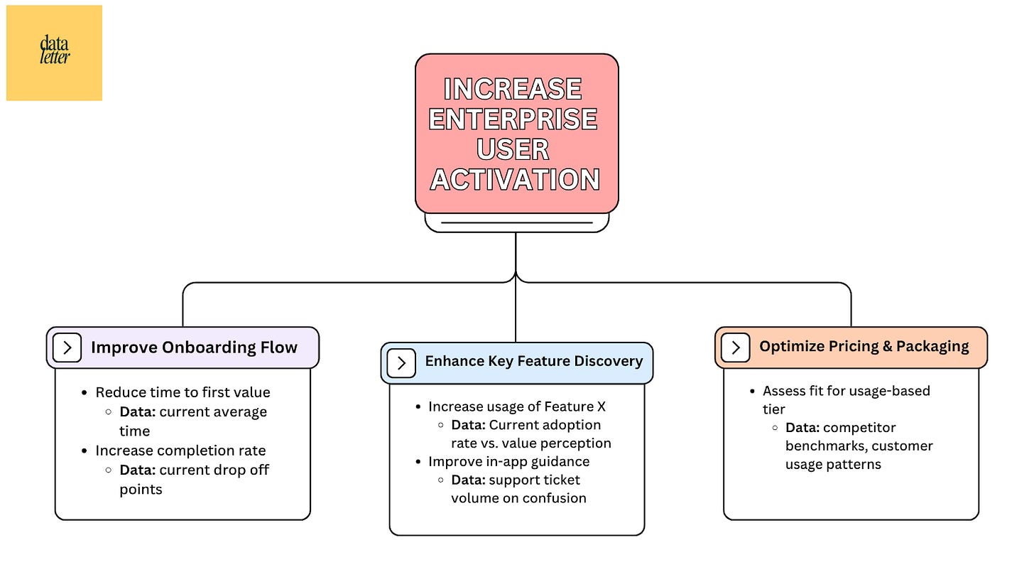 Break your core opportunity or problem down into its parts. If your goal is “Increase Enterprise User Activation,” your issue tree might look like this: