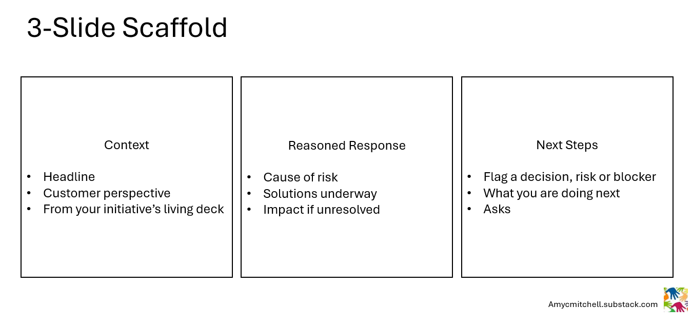This scaffold forces clarity. It’s just enough to help leadership decide, and simple enough to prepare without derailing your real work.