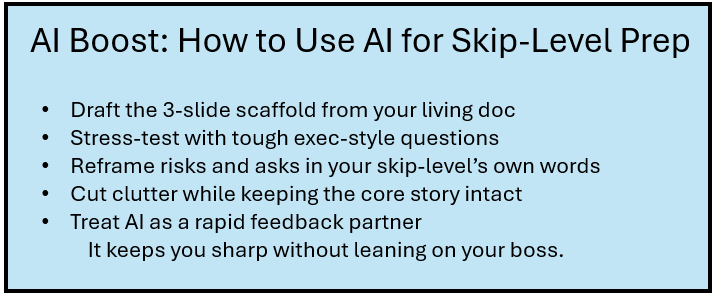 This stepwise compression produces a concise, confident narrative. And here’s the key: your manager shouldn’t have to rescue you. The strongest skip-level readouts are when the boss does very little and you deliver near-final material directly.